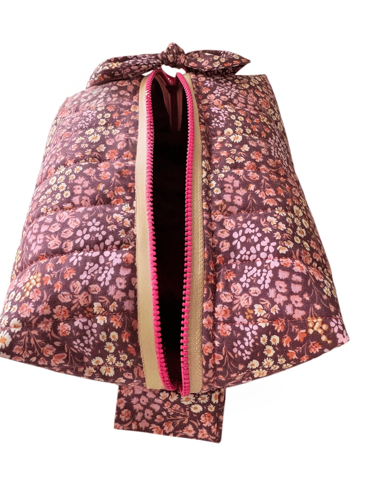 Add a touch of charm to your everyday routine with this beautifully quilted makeup bag. Crafted from soft cotton fabric, it features a delicate floral print in rich, earthy tones that feel both timeless and effortlessly elegant.